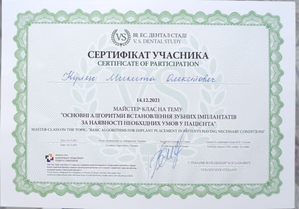 - Майстер-клас на тему: “Основні алгоритми встановлення зубних імплантантів за наявності необхідних умов у пацієнта” 2021р.