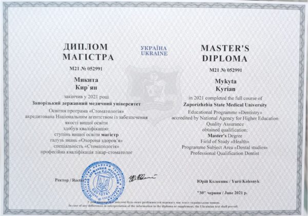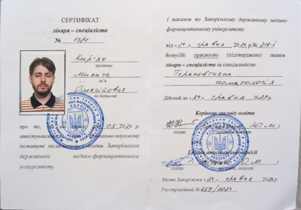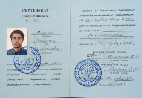 У 2023 році закінчив інтернатуру на базі Запорізької міської стоматологічної поліклініки № 2