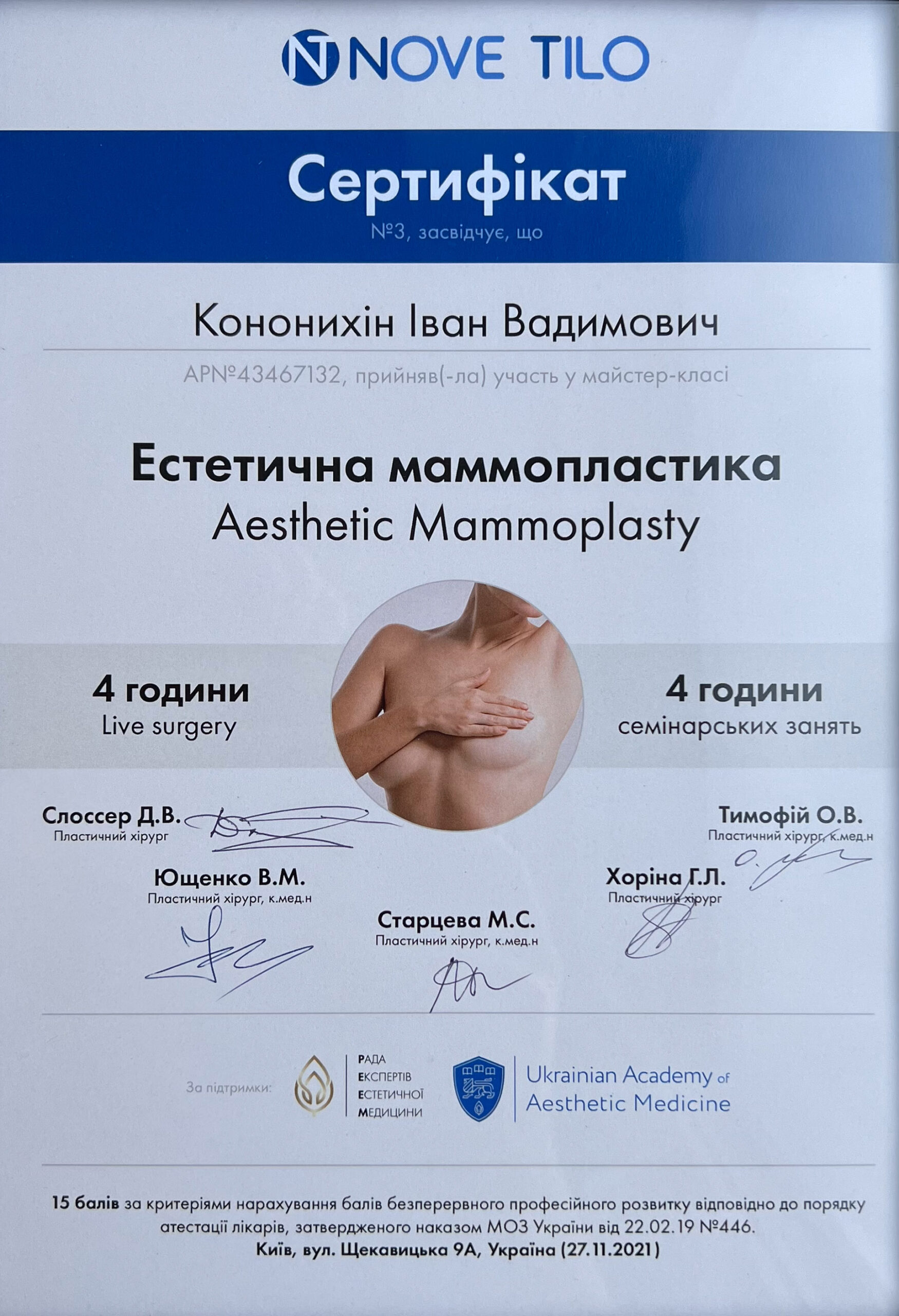 - 2021 г. – майстер-клас «Естетична маммопластика» (м. Київ)