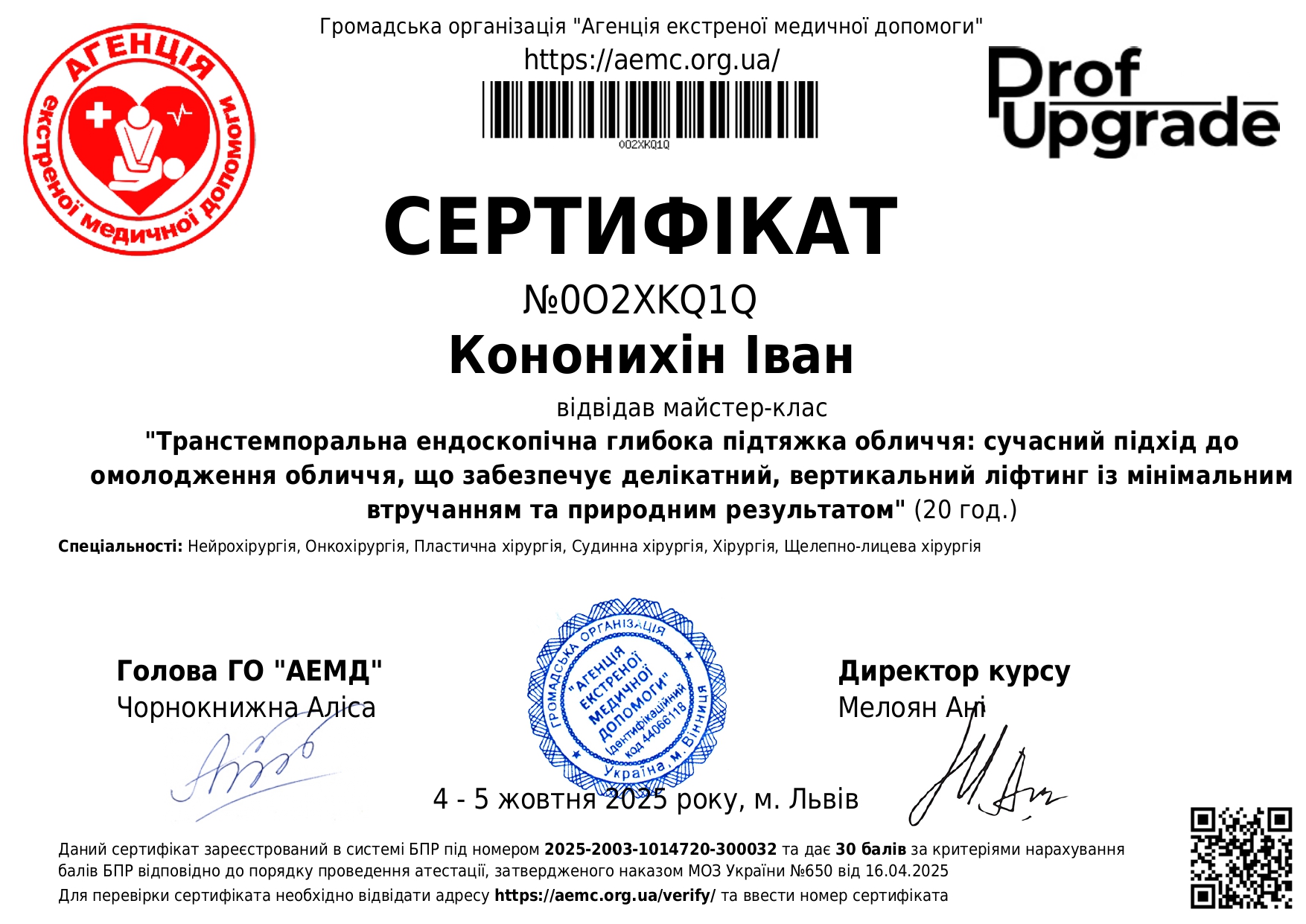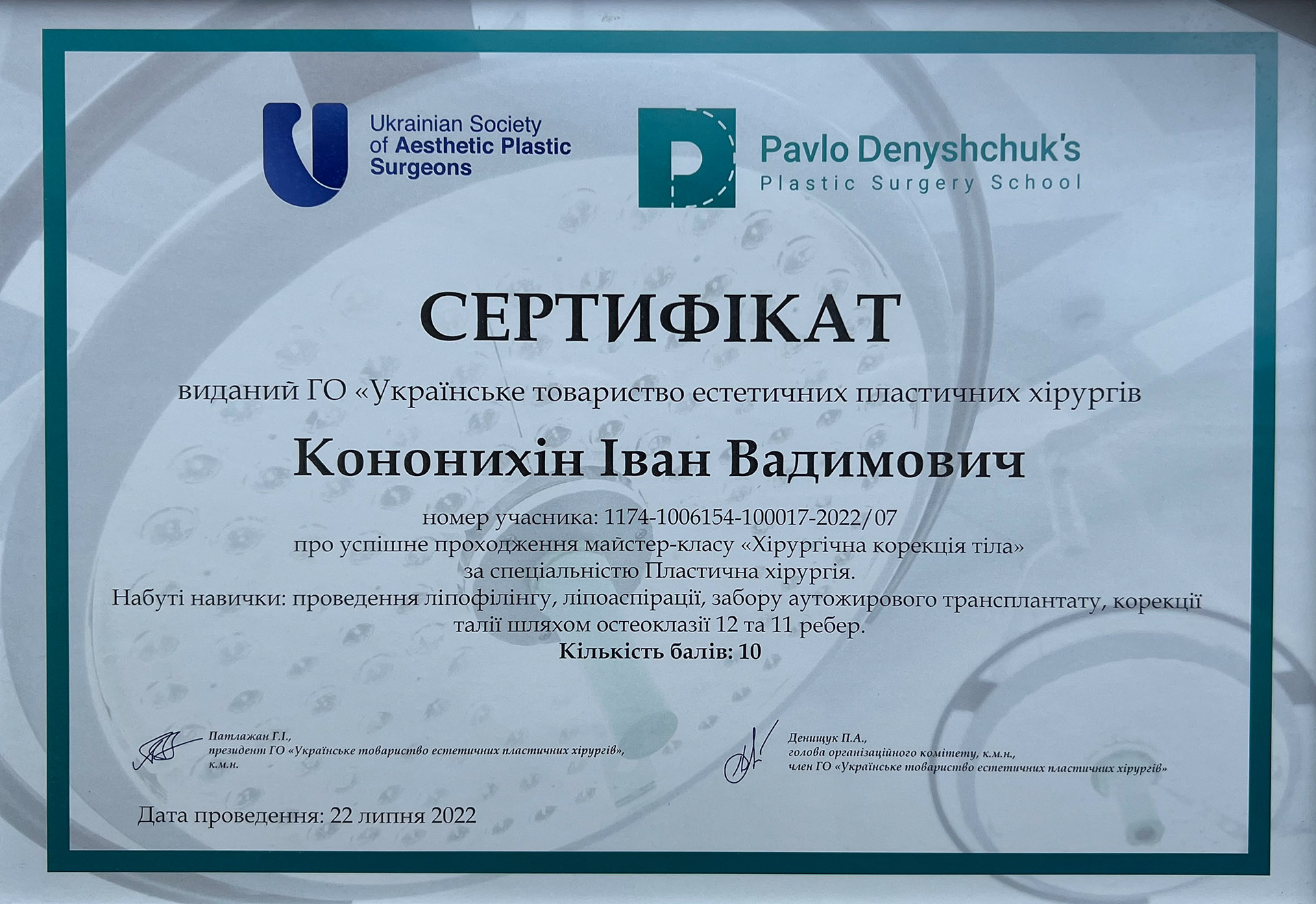 - 2022 г. – майстер-клас «Хірургічна корекція тіла» за спеціальністю Пластична хірургія