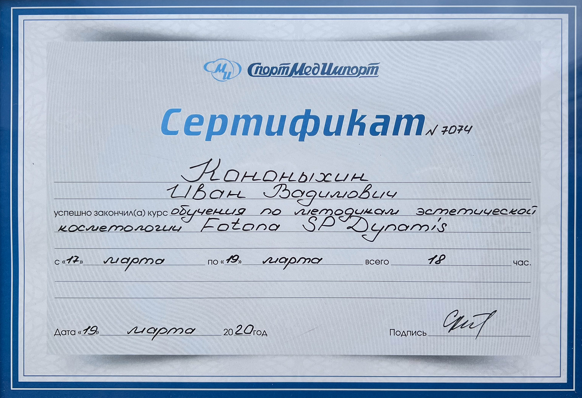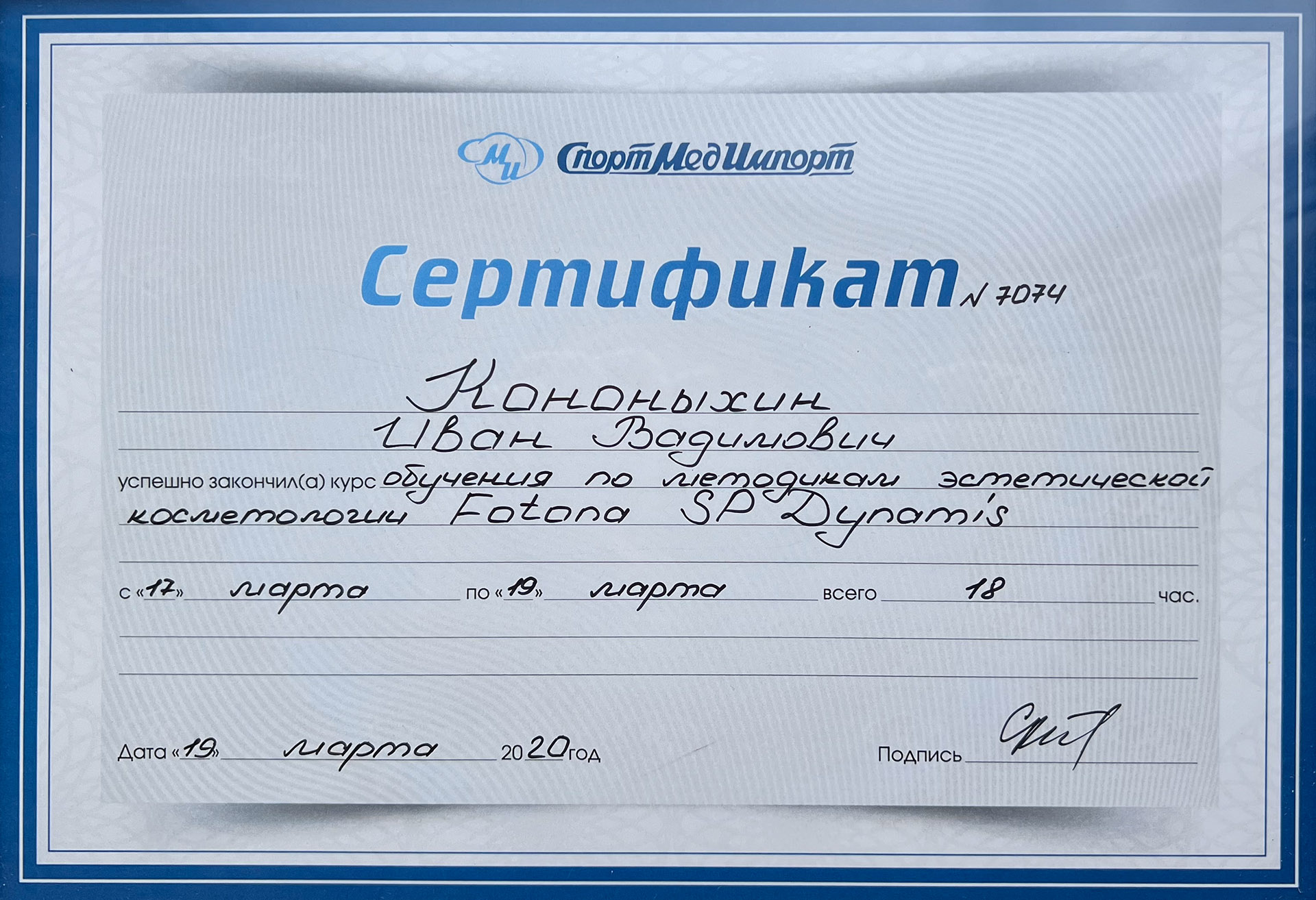 - 2019 р. – навчання методикам естетичної косметології Fotona SP Dynamis