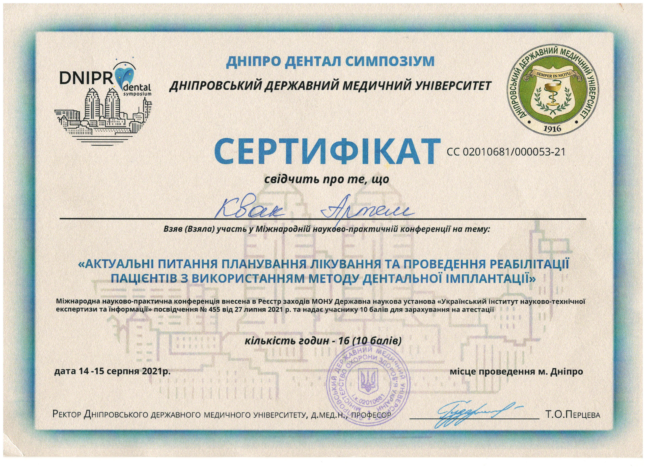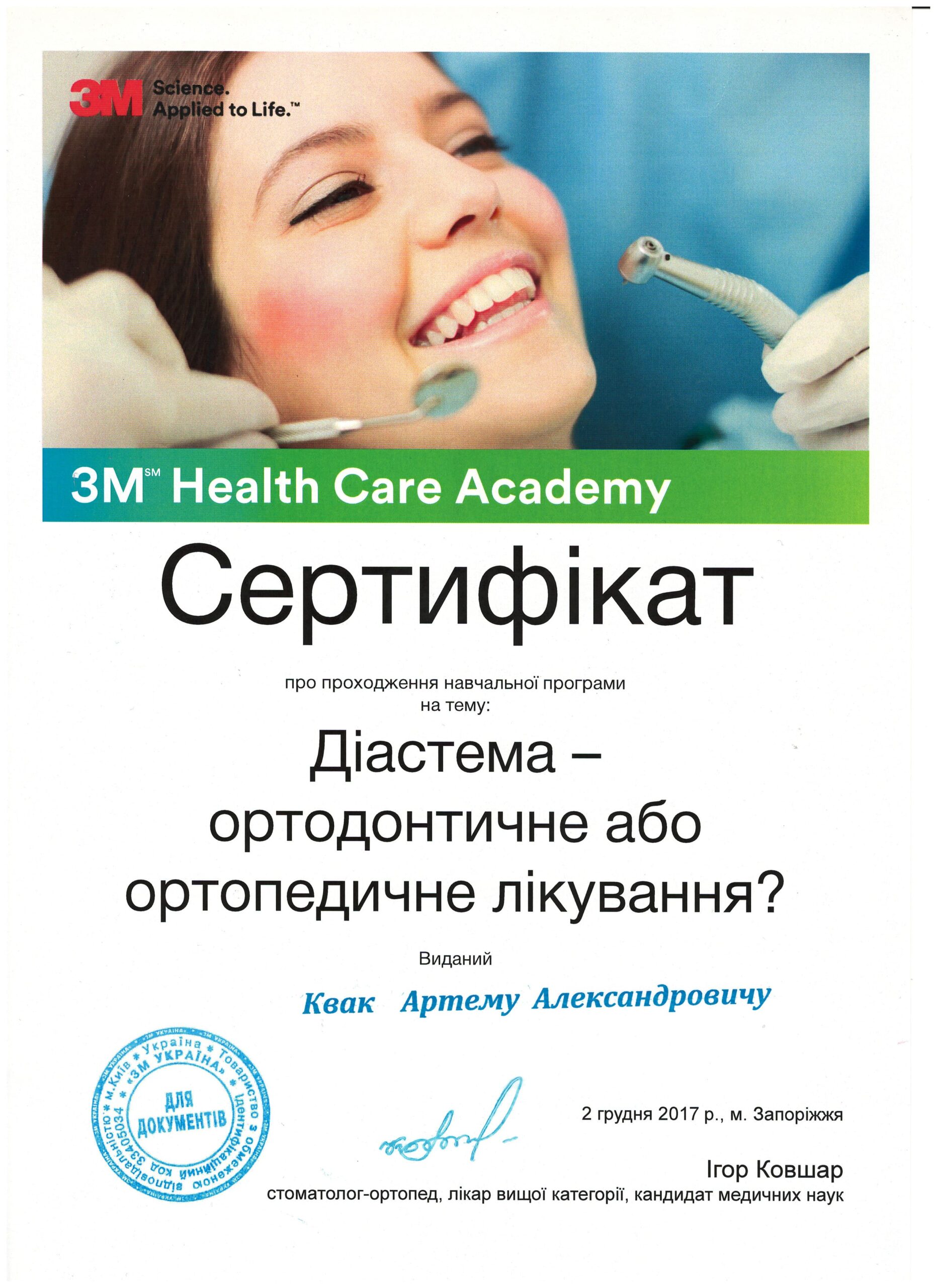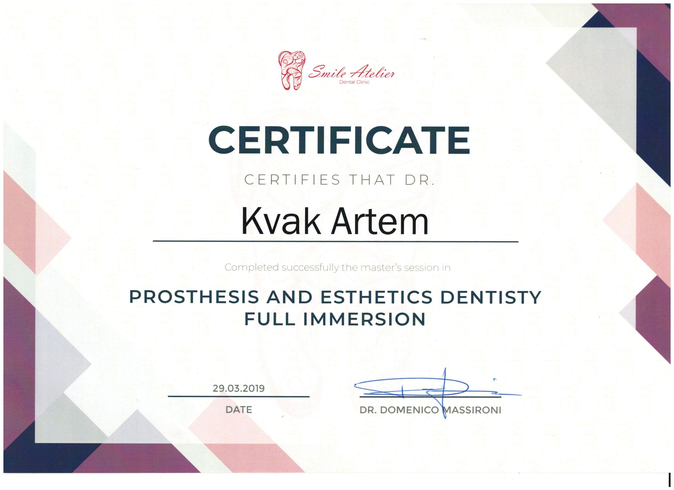 - У 2024 році Артем Олександрович освоїв спеціалізацію з хірургічної стоматології на базі Запорізької державної медичної академії післядипломної освіти.
