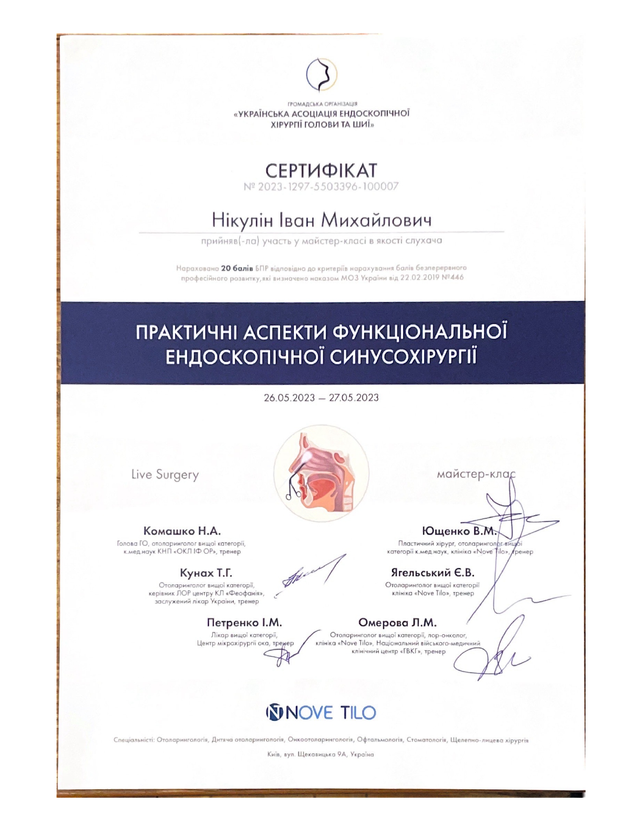- 2017-2019 закінчив інтернатуру за спеціальністю “Оториноларингологія”.