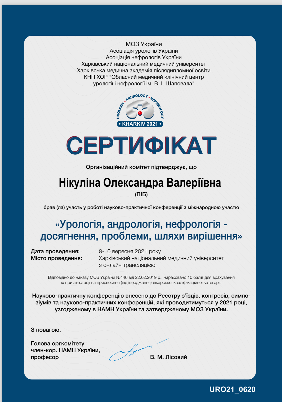 - Науково практична конференція з міжнародною участю «Урологія, андрологія, нефрологія – досягнення, проблеми, шляхи вирішення” (Харків, 2022р)
