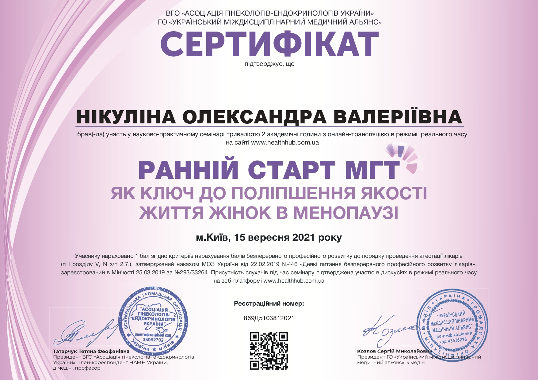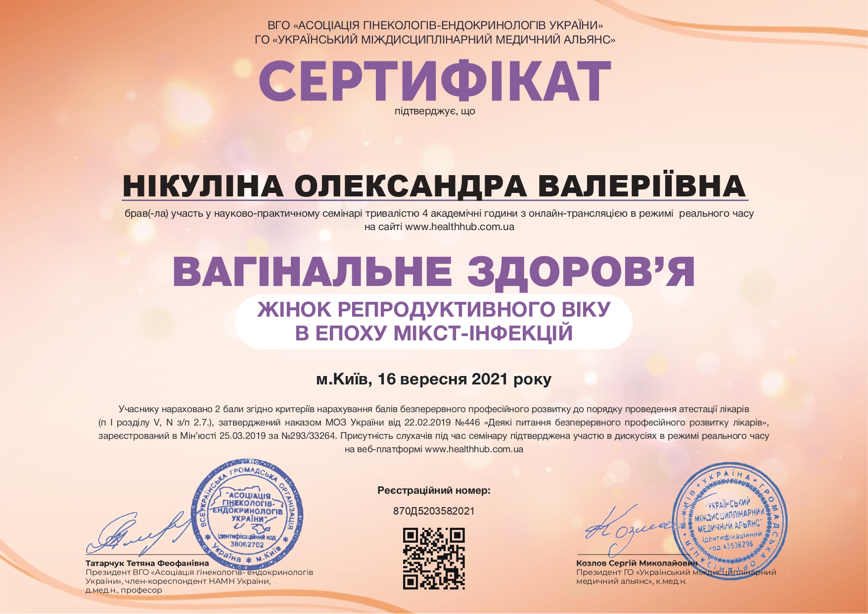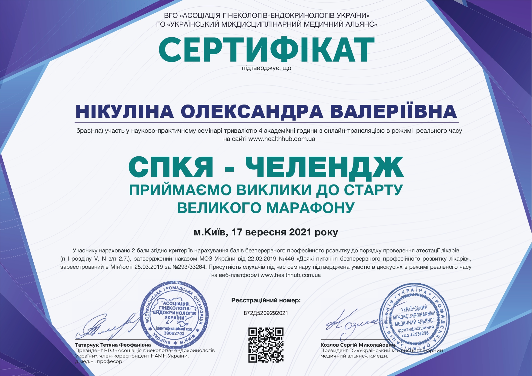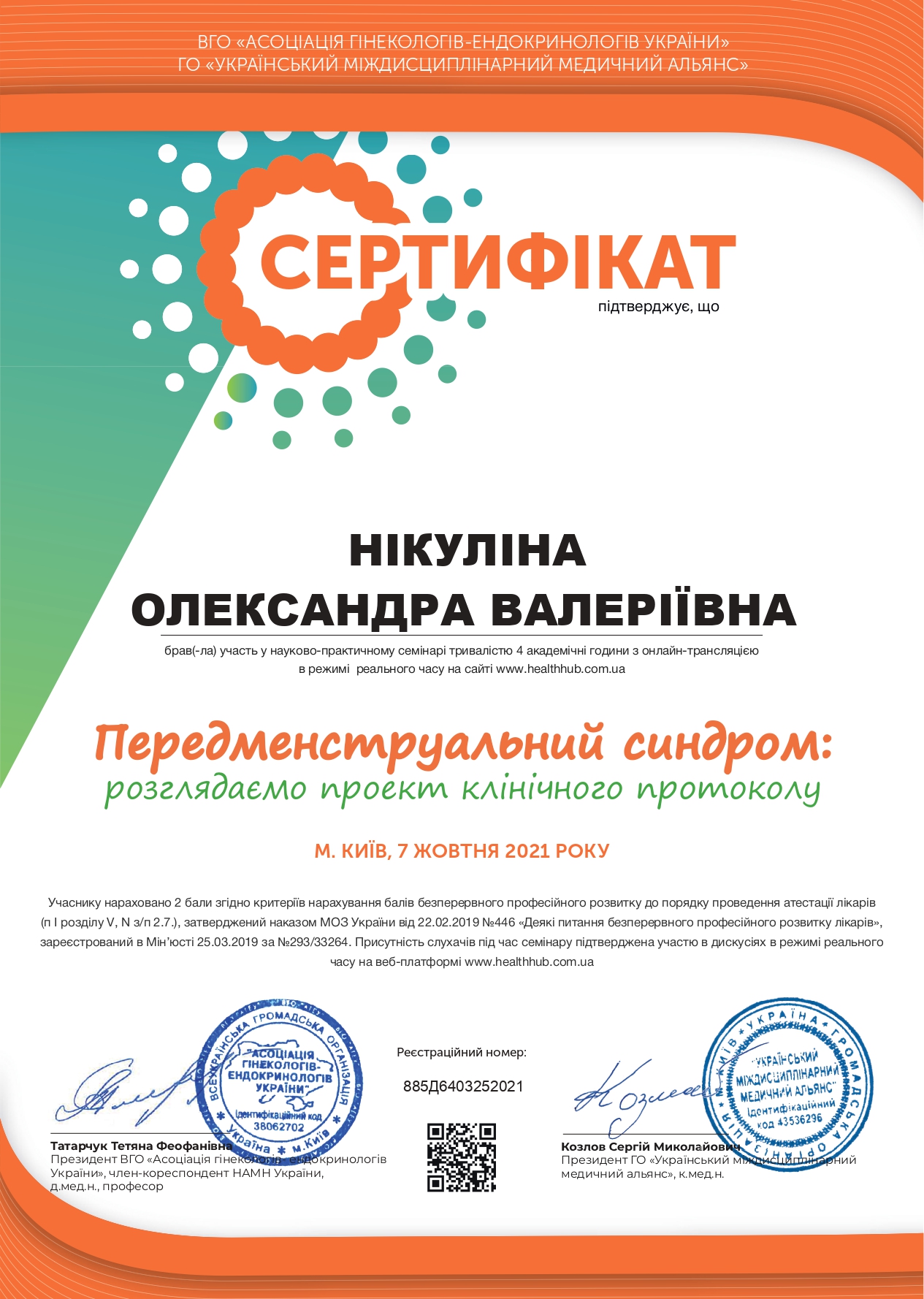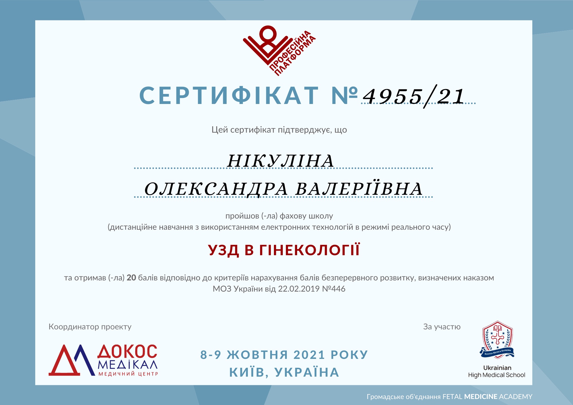 - Інтернатура при Запорізькому державному медичному університеті (2021 р.) на Базі